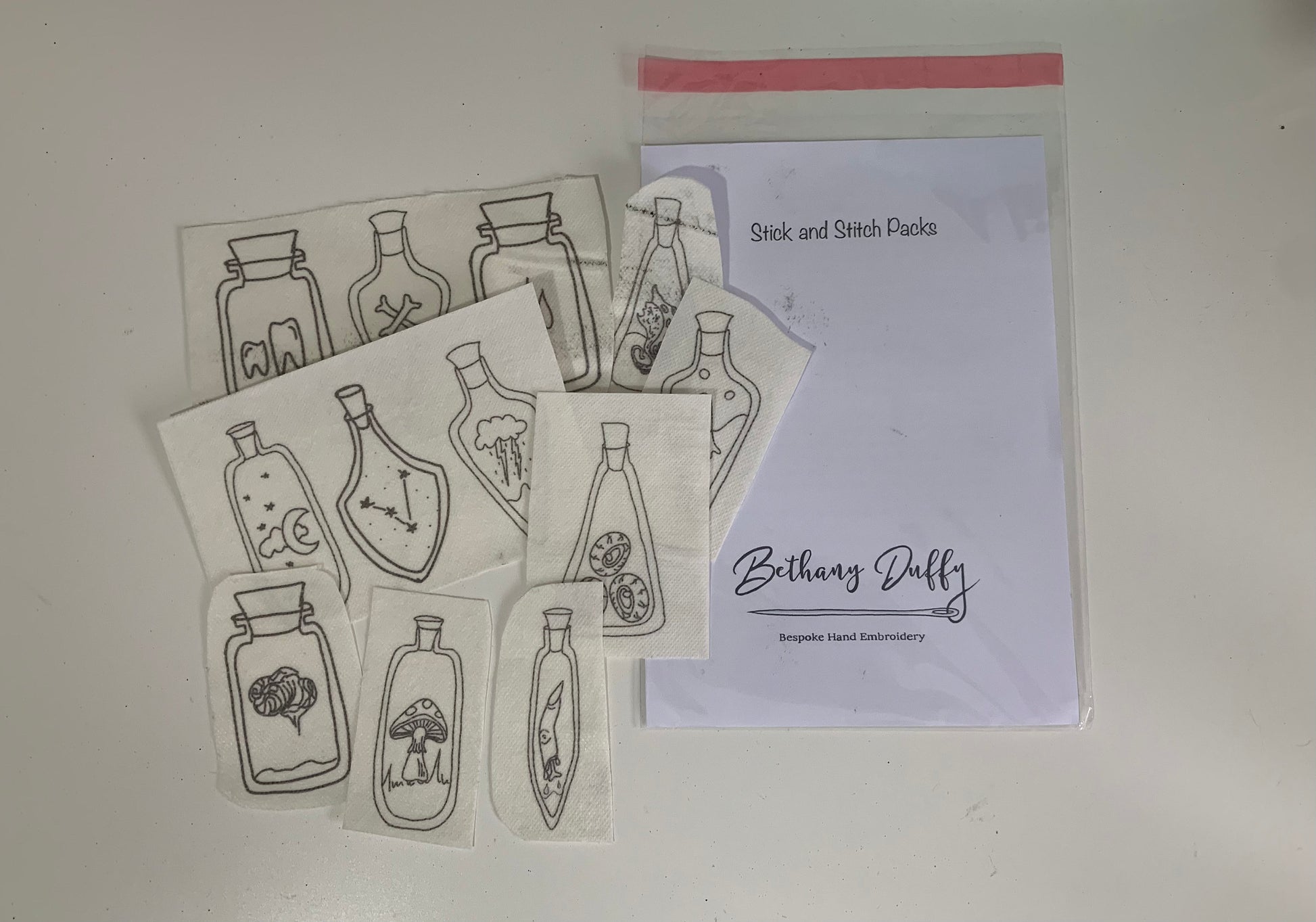 The potions stick and stitch pack, each designed by me for you to create, stitch and have fun with. Printed onto stick and stitch embroidery stabiliser. It it a material that is sticky, so you peel the design and place it where you want to start stitching.
